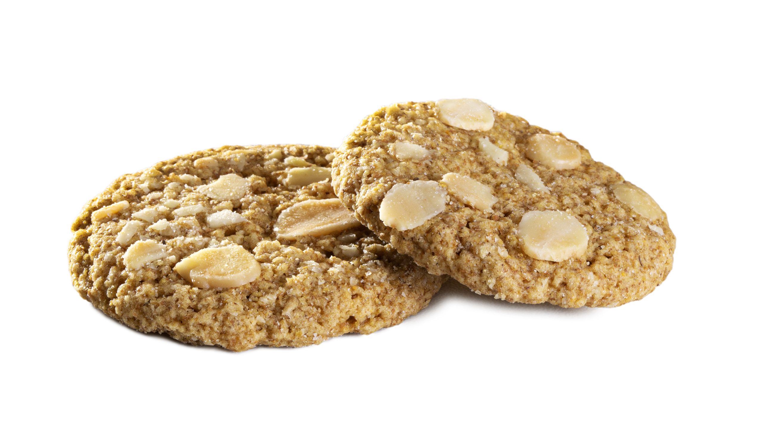 INGREDIENTES: Farinha de trigo 100% integral, aveia integral, edulcorante natural maltitol, óleo de palma, amêndoas, fibra vegetal, fermento (bicarbonato de sódio), sal marinho, stévia e aroma de baunilha.