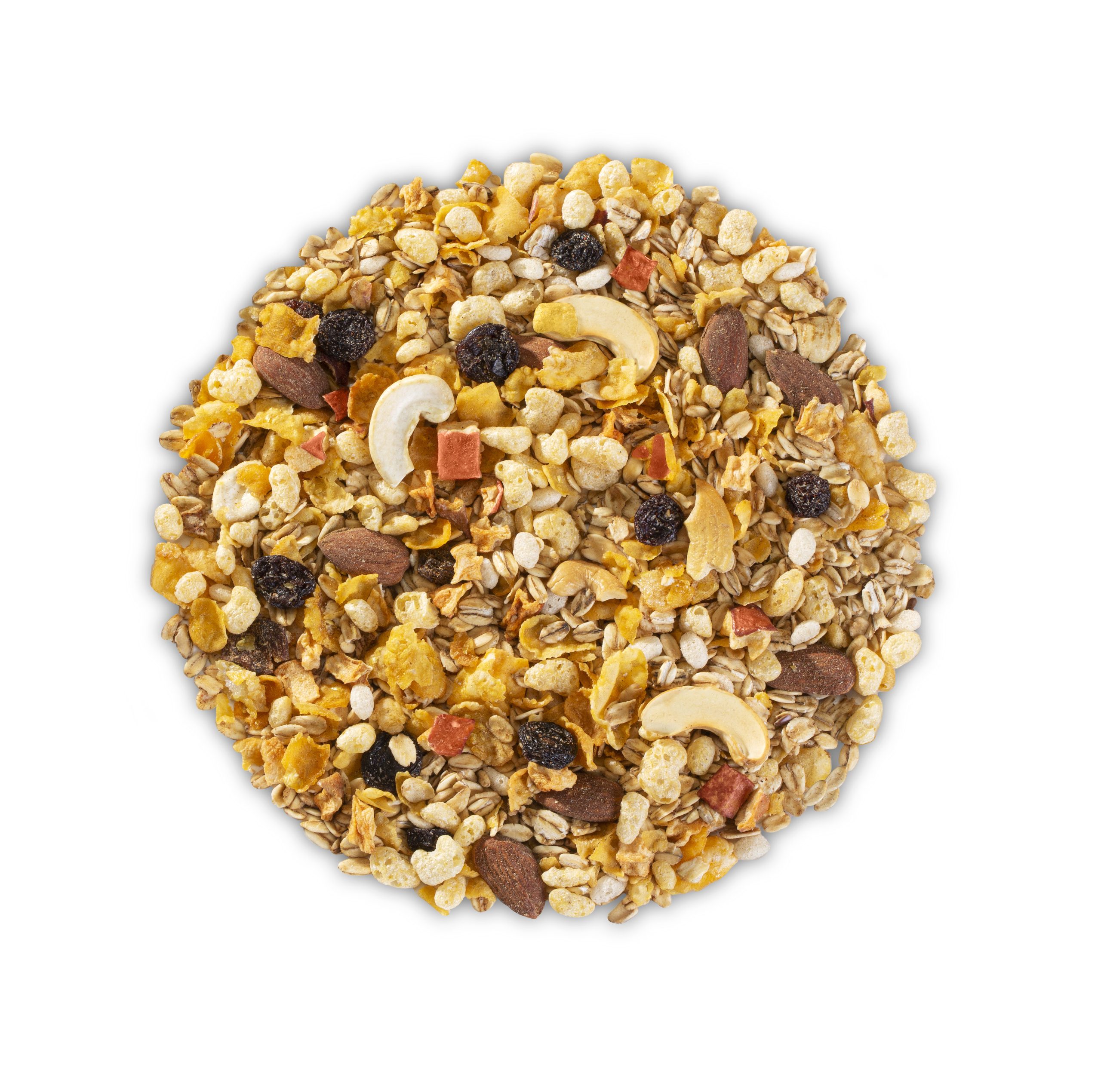 INGREDIENTES: Aveia integral sem glúten, amêndoa, castanha de caju, flocos de milho não transgênico sem glúten, uva passa, gergelim integral, linhaça, óleo de girassol, maçã desidratada, flocos de arroz, canela, beterraba desidratada (0,002%) e sal marinho.